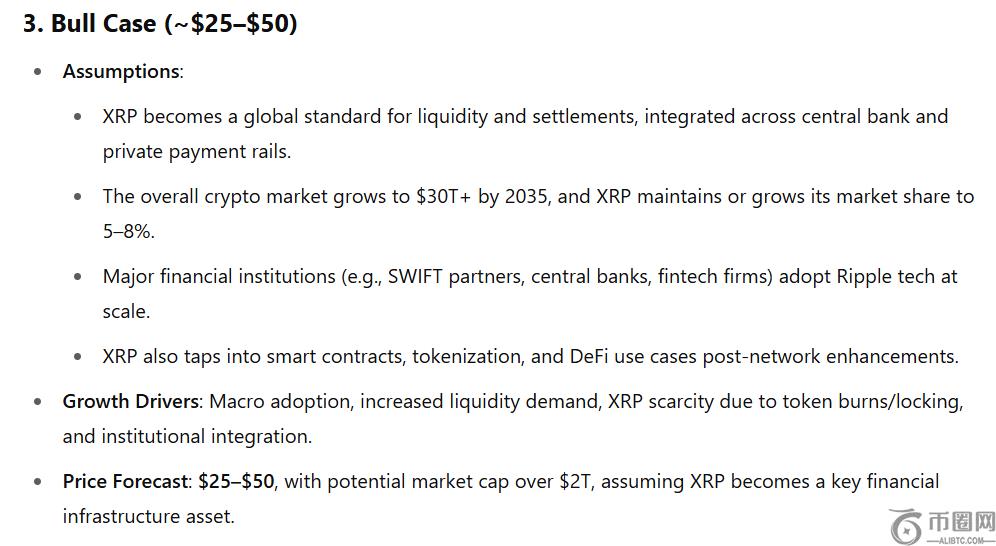 然而,对于最乐观的前景,Grok 认为 XRP 的价格到 2035 年可能会攀升至 45 美元至 60 美元之间。这一牛市假设基于全球加密市场规模扩大至 20-25 万亿美元、XRP 的主导地位提升至 8% 以及广泛融入央行数字货币 (CBDC)、DeFi 平台和资产**化系統。