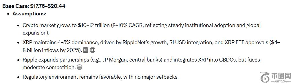Grok 在其基准情景下预测 XRP 价格可能在 17.76 美元至 20.44 美元之间。值得注意的是,这假设加密货币市场增长至 10-12 万亿美元。和XRP 维持 4–5% 的主导率。