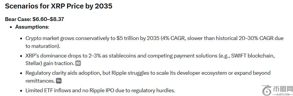 在 Grok 的悲观假设中,如果全球加密货币市场到 2035 年保守增长至约 5 万亿美元,而 XRP 的主导地位下降至 2-3%,那么该**的交易价格可能会在 6.60 美元至 8.37 美元之间。这一结果假设 XRP 面临来自稳定币等替代货币的日益激烈的竞争,平台例如恒星.