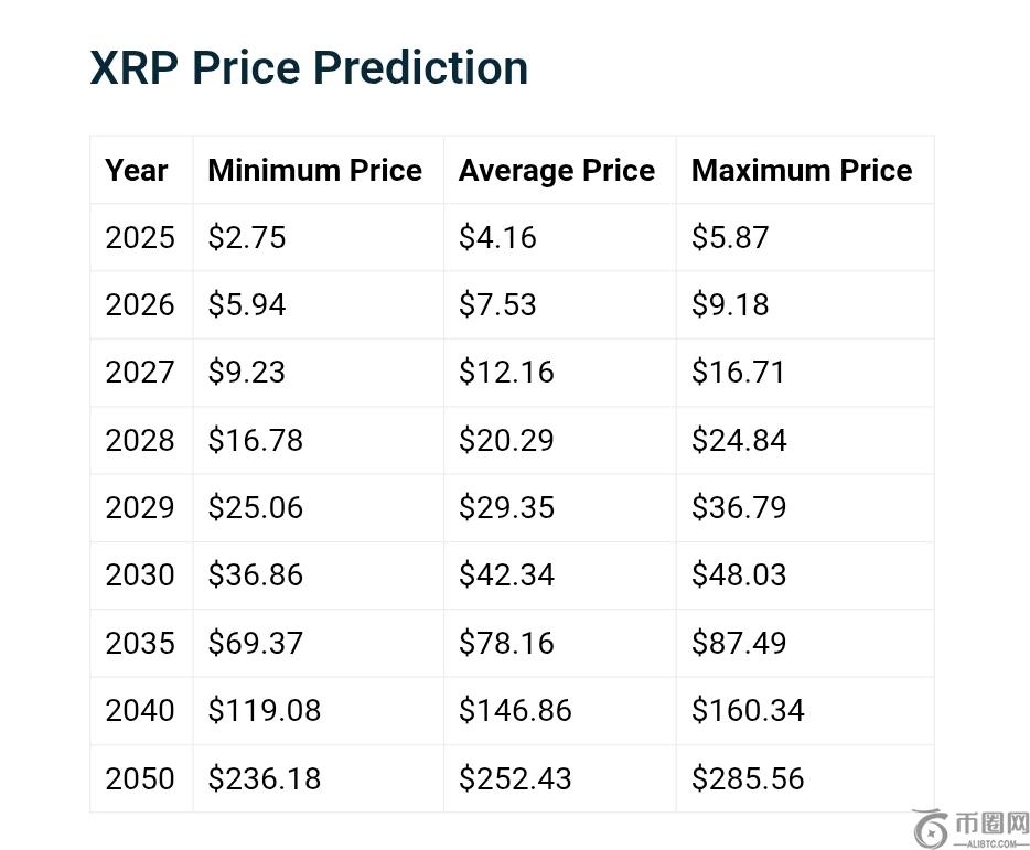 有趣的是,Telegaon 的分析师给出了更为激进的预测。他们认为,到 2035 年,XRP 的**价格可能达到 69.37 美元,平均价格可能达到 78.16 美元,**价格可能达到 87.49 美元。