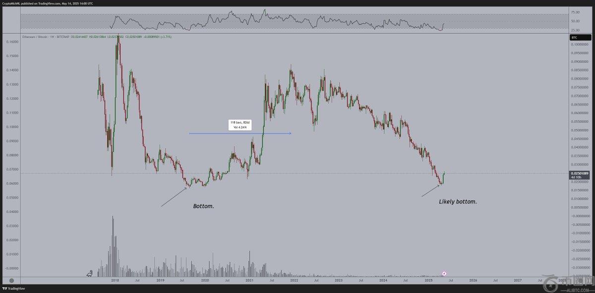 该分析师还说ETH 可能相对于比特币处于上升趋势(ETH/比特币) 在周线图上呈现出类似的 2019 年触底形态。