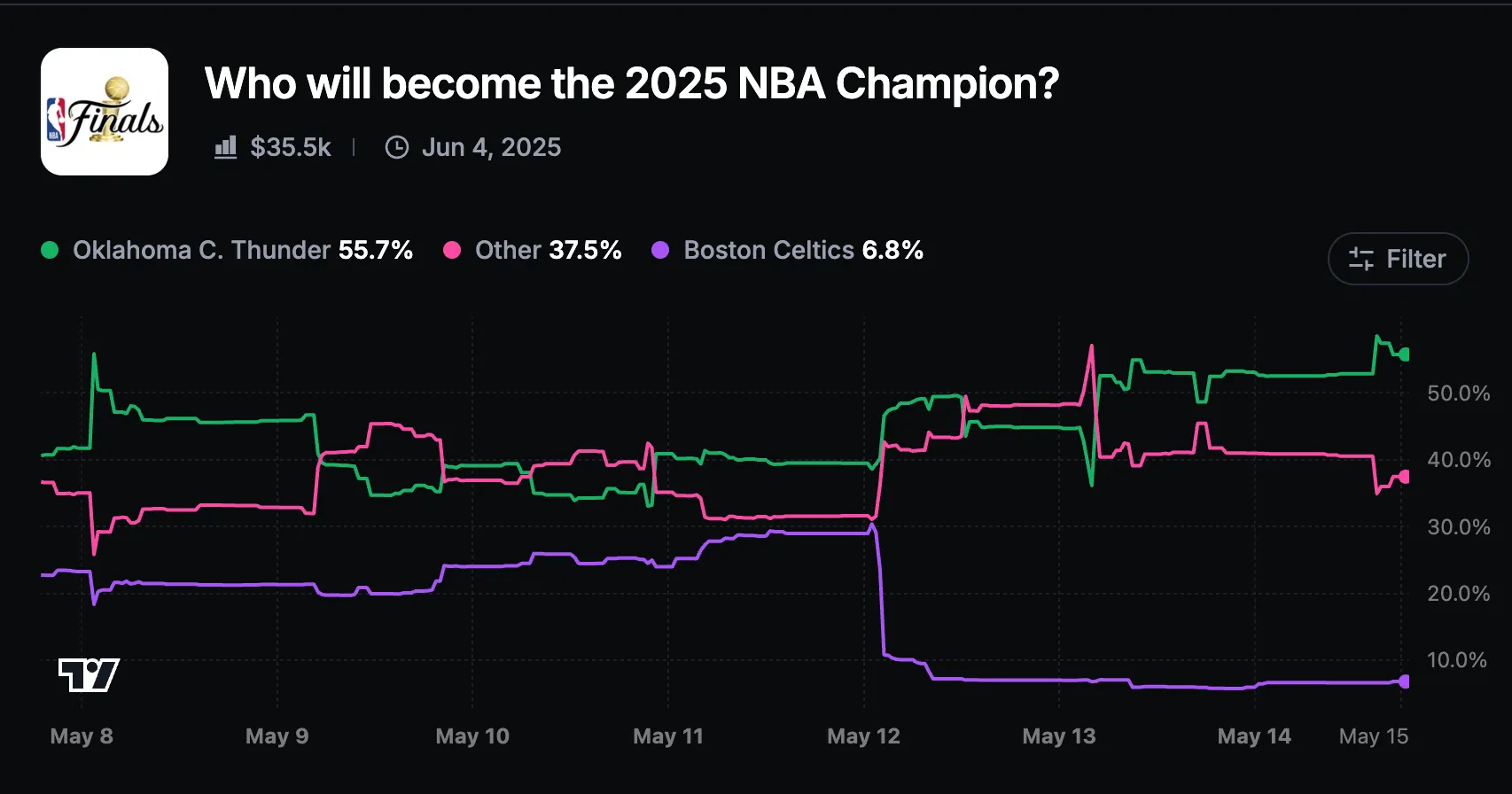 在 上周的更新,与传统体育**公司相比,Myriad 上的预测者略微低估了俄克拉荷马城雷霆队或波士顿凯尔特人队今年夺冠的几率。