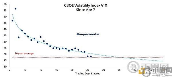比特币网络经济学家蒂莫西·彼得森强调,VIX指数在过去25个交易日内已从55大幅下降至18。