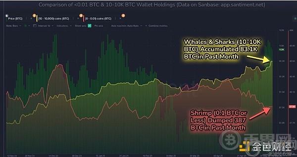 Santiment 的补充数据显示,持有 10 至 10,000 BTC 的地址在过去 30 天内累计增持了 83,105 BTC。