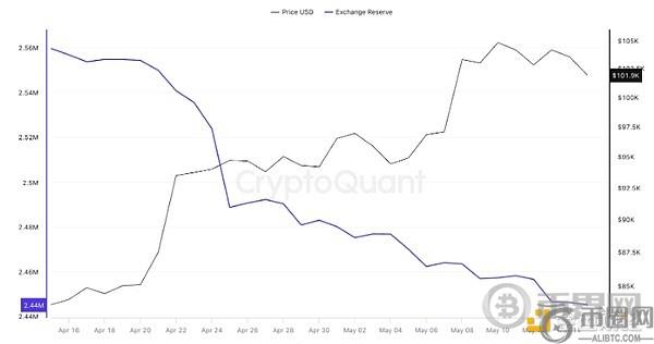 5月15日,交易所比特币余额降至244万枚,为六年来**水平。根据下图,过去30天,已有超过11万枚比特币从交易所转移。