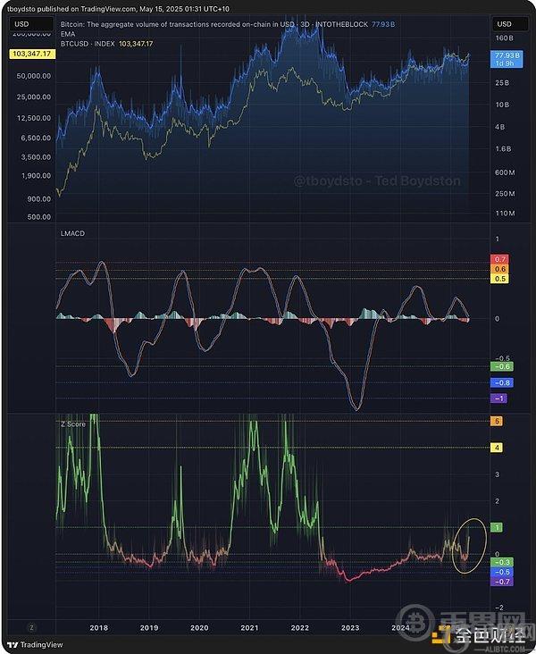 下图显示,该指标已从负值区域急剧上升,接近1。交易量Z值的上升,尤其是在接近或超过1时,历来与比特币价格上涨相关。