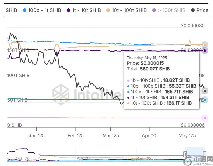 在这些乐观的预测中,持有至少 10 亿 SHIB 的 Shiba Inu 钱包仍在持续增持**,尽管速度**。具体来说,持有 10 亿至 100 万亿 SHIB 的钱包在今年年初持有了 559.33 万亿枚**。如今,它们抓住560.07万亿,较上年小幅增加7400亿枚。