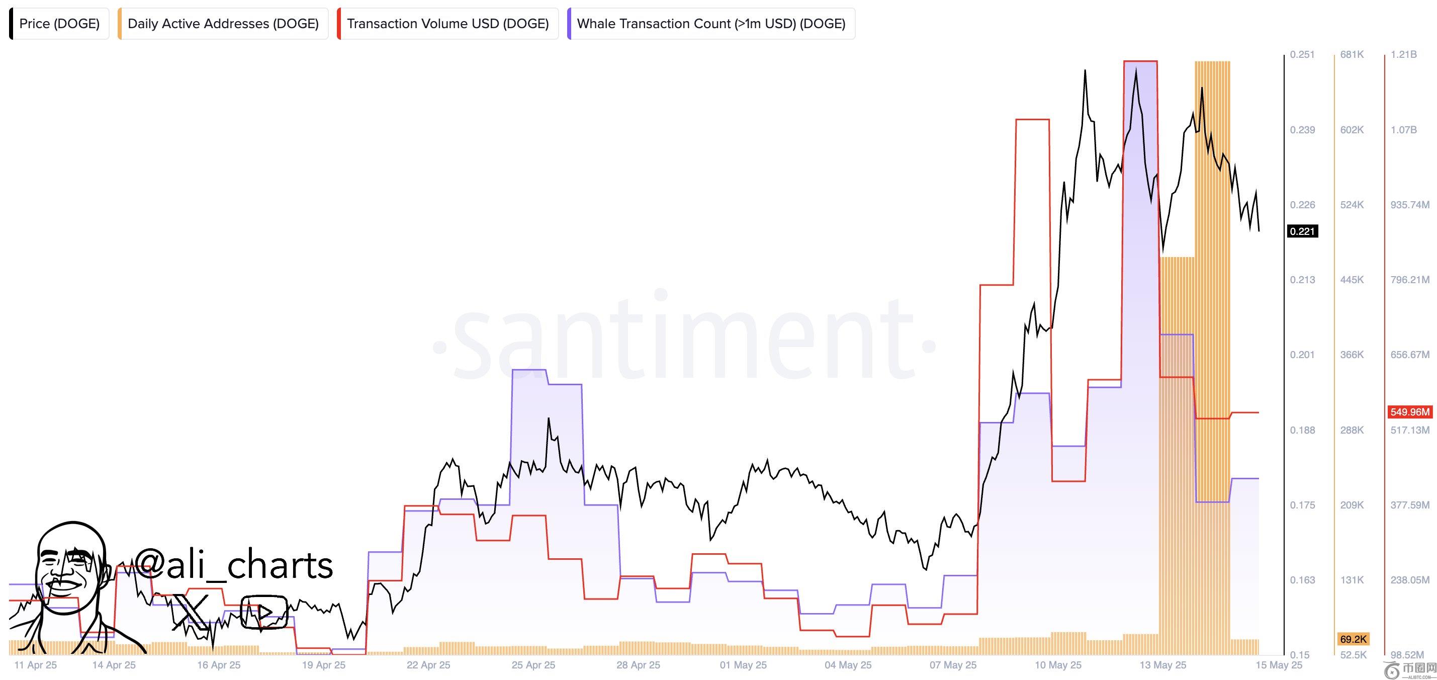 然而,到 5 月 13 日至 14 日,活跃地址数量大幅下降,表明用户活动出现了短期冷却。尽管出现了下降,狗狗币的价格继续远高于早前的盘整水平。这一持续的走势表明,该网络的结构比前几个月更加稳健。