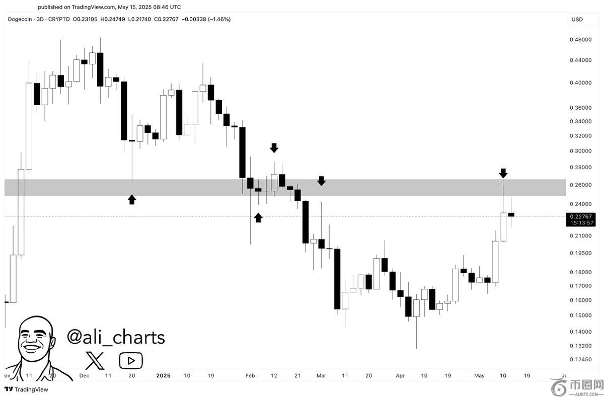 一张技术图表共享市场分析师阿里·马丁内斯(Ali Martinez)强调,自2024年底以来,狗狗币的走势在3日时间框架内存在持续的阻力位。该区域位于0.25美元至0.26美元之间。历史上对该区域的回调多次显示出价格被拒绝的迹象。