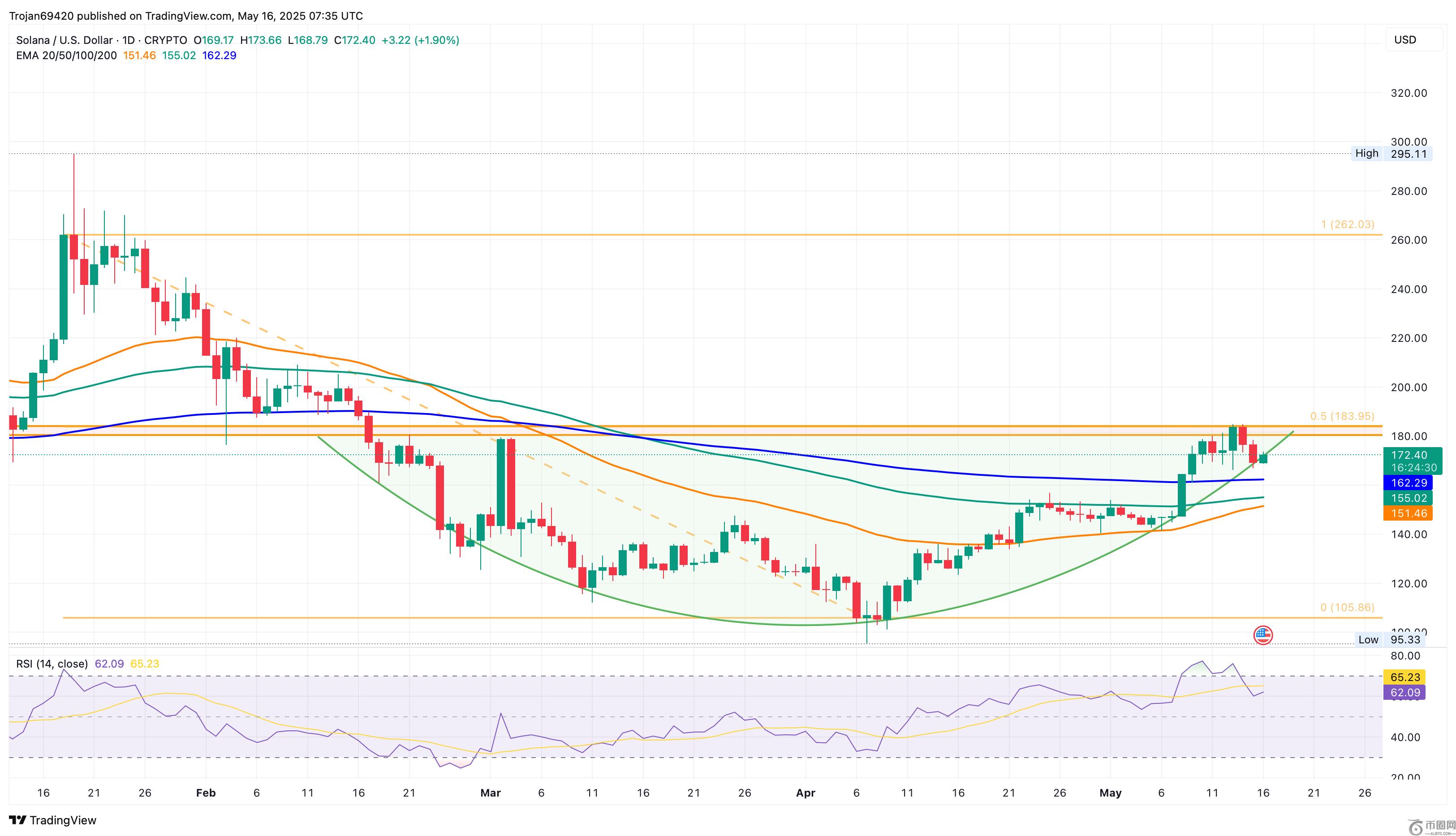 Solana 目前的股价为 172 美元,在过去两天下跌 7% 之后,今日上涨 1.75%。SOL从连续两根红色蜡烛中恢复,暗示着重大突破反弹,形成圆底形态。