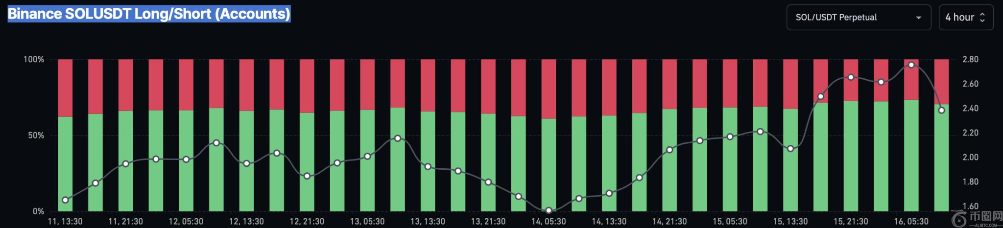 币安交易员似乎对 Solana 的价格走势非常乐观。根据用户账户数据,SOLUSDT 交易对的多空仓位比率为 70.45%。整体多空仓位比率为 2.38,表明市场看涨情绪强烈。这位交易员的乐观情绪可能会推动 Solana 价格在杠杆作用下上涨。