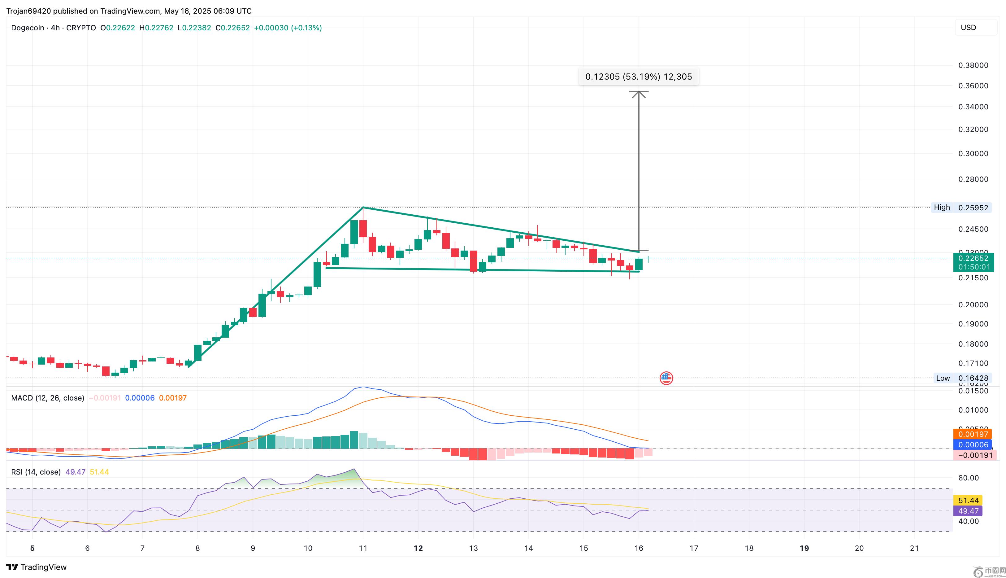 在 4 小时图上,狗狗币在5月11日达到0.25美元的峰值后,狗狗币价格在窄幅区间内回调。随着看涨势头减弱,狗狗币价格形成更低的高点,形成下行趋势线。然而,0.2183美元附近的强劲支撑位已形成三角形态。