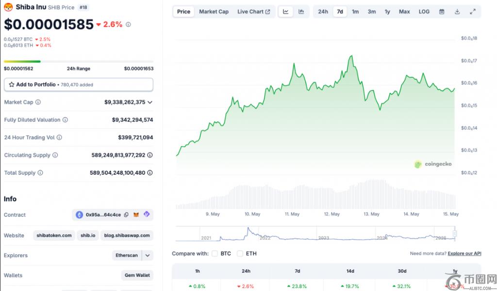 目前,Shiba Inu 的价格预测指标显示,SHIB 在所有加密货币中排名第 18 位,市值约为 93 亿美元。尽管出现了一些短期波动(这在当今加密货币市场中相当常见),但 Shiba Inu **在过去一周仍上涨了约 24.8%。
