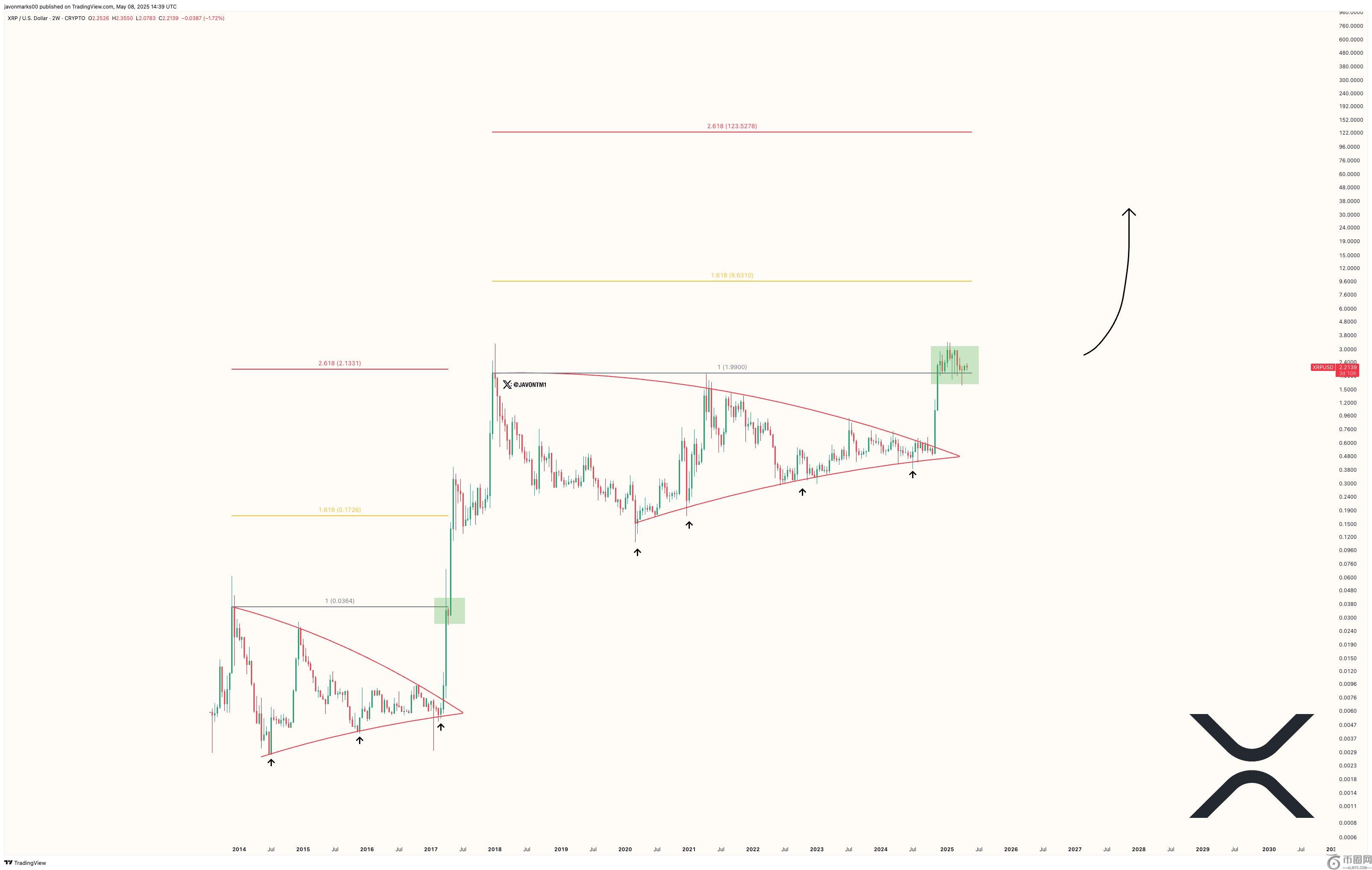 与此同时,XRP 进入了更长时间的盘整阶段,持续了七年多。Marks 的图表证实,XRP 现已完成对 2018 年形成的多年三角旗形态的突破。