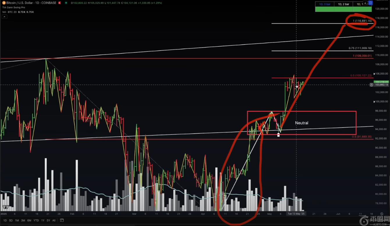 “如果 BTC 能够突破这一水平(约 106,000 美元),那么我的下一个目标当然是,这里的高点在 108,000 美元到 109,000 美元之间……但我们波动幅度的 75%(从约 74,000 美元开始)将带我们达到 111,000 美元。