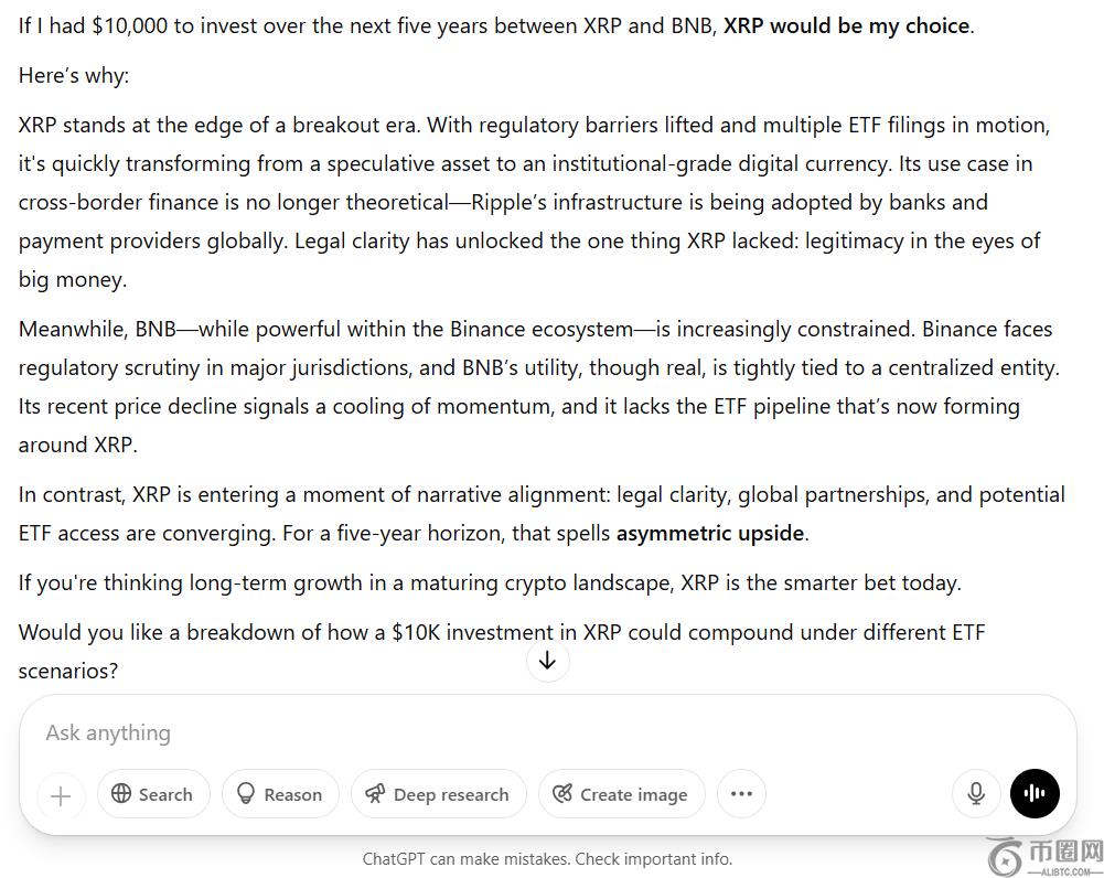 10,000 美元的 XRP 或 BNB?ChatGPT 和 Grok AI 怎么说?