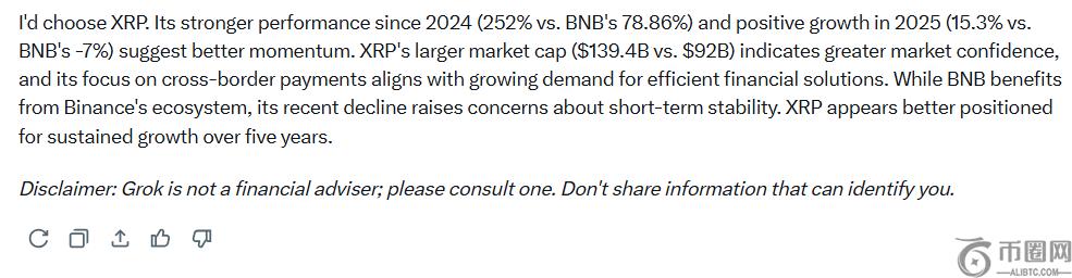 Grok 对 XRP 也表现出了类似的偏好,但其理由更多地倾向于表现和市场情绪。xAI 模型指出,自 2024 年初以来,XRP 的表现一直优于 BNB,并且还2025 年保持积极势头,与 BNB 近期的损失形成鲜明对比。