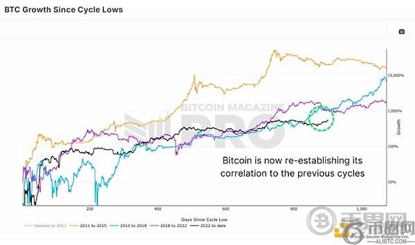 最近的比特币价格飙升刷新了人们的预期。根据“周期低点以来比特币的增长”图表,尽管面临宏观挑战和回调,但比特币的走势与 2016-2017 年和 2020-2021 年的周期走势高度一致。