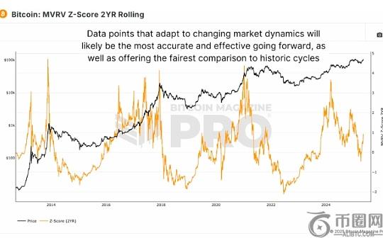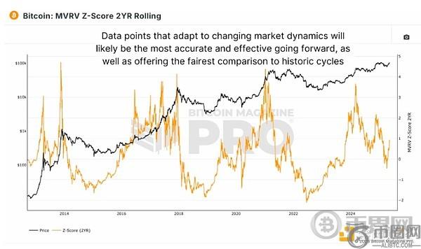 为了衡量加密货币投资者的心理,两年** MVRV-Z 评分提供了关键见解。这一**指标考虑了丢失的**、流动性不足的供应、不断增长的 ETF 和机构持仓,以及比特币长期持有者行为的变化。