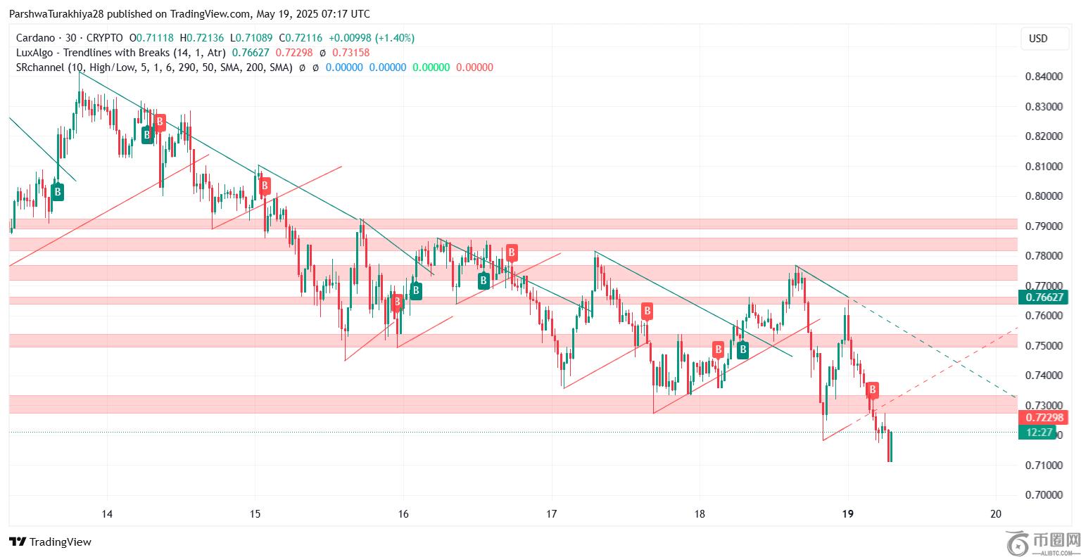 卡尔达诺今日交易价接近 0.722 美元,在 0.766 美元附近反复失守后,跌破关键移动平均线和趋势线支撑位。这标志着卡尔达诺价格走势的关键时刻,因为该资产目前徘徊在 0.720 美元支撑位上方。若日收盘价跌破该区域,则 ADA 可能面临更深的回调,跌向 0.6768 美元附近的 61.8% 周线斐波那契回撤位,而反弹则可能重燃看涨信号,重新测试 0.77 美元。