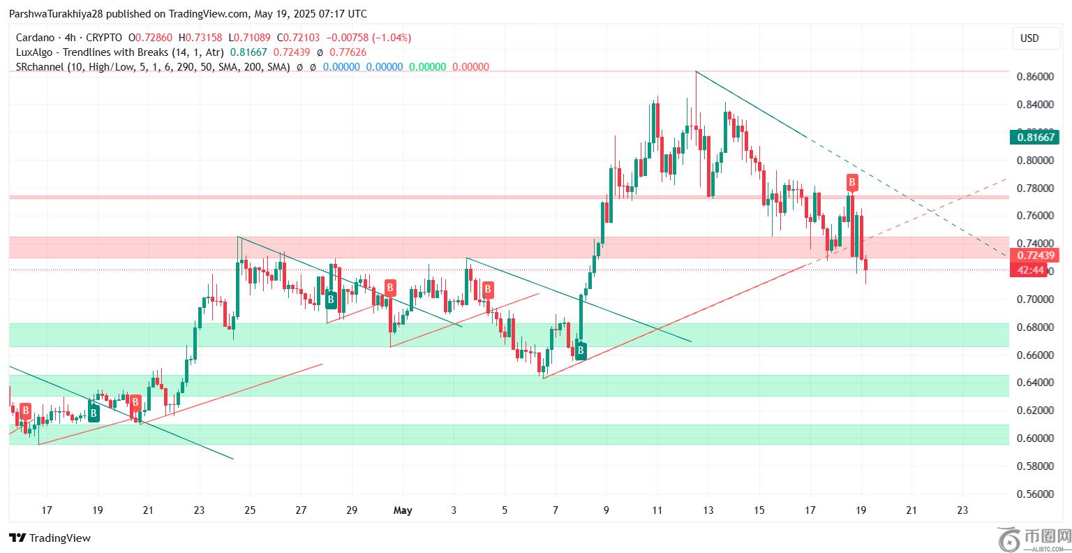 日线图证实了该区域的重要性,显示ADA在5月初于该区域上方盘整,随后突破至0.8166美元。若未能迅速收复支撑位,则可能导致更高时间框架内形成看跌延续形态。
