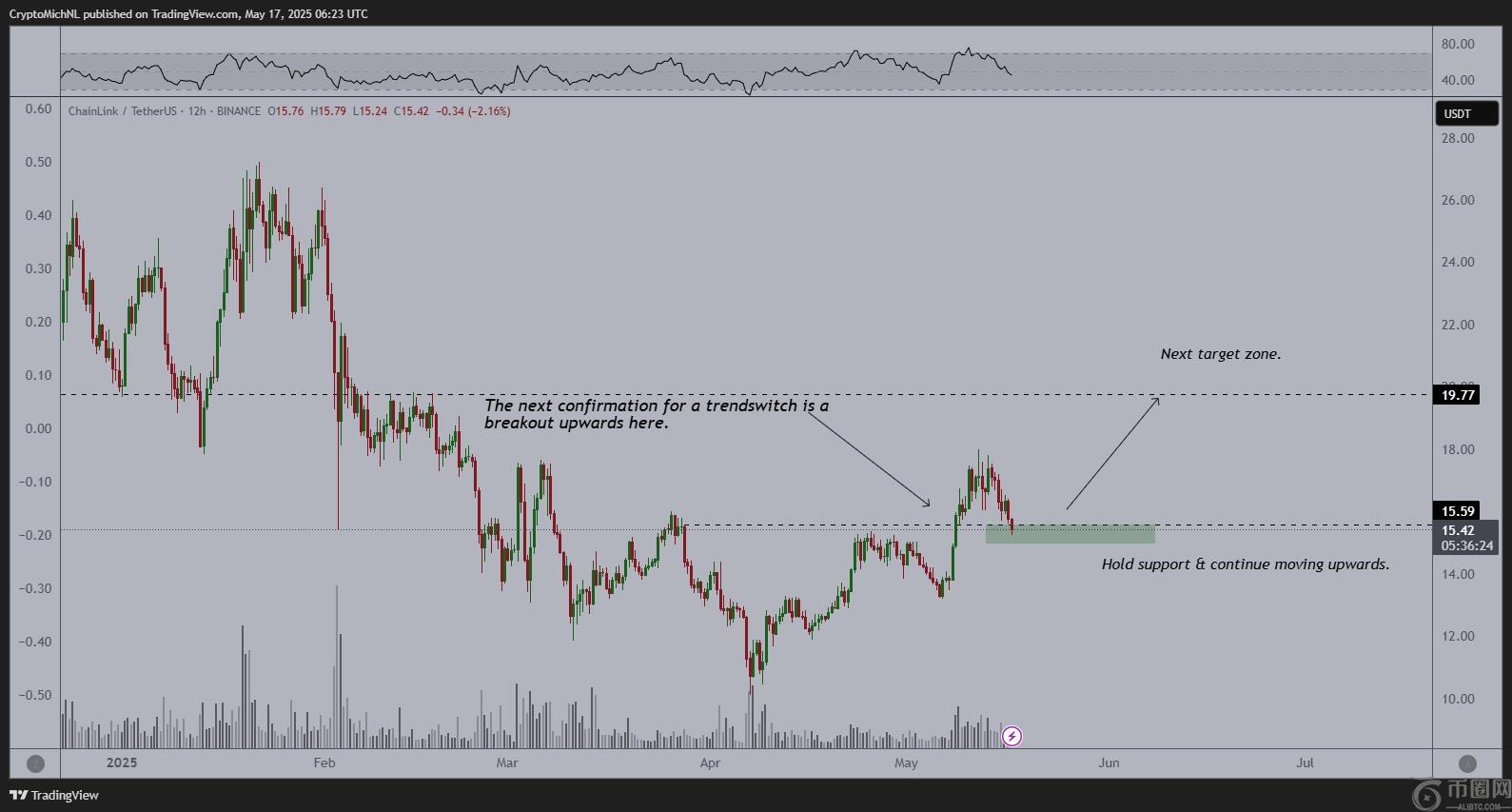 该交易员还关注去**化区块链预言机服务 Chainlink(关联)。据 Van de Poppe 称,LINK 未来极有可能是一个稳健的投资标的,14 美元的水平是多头的潜在切入点。