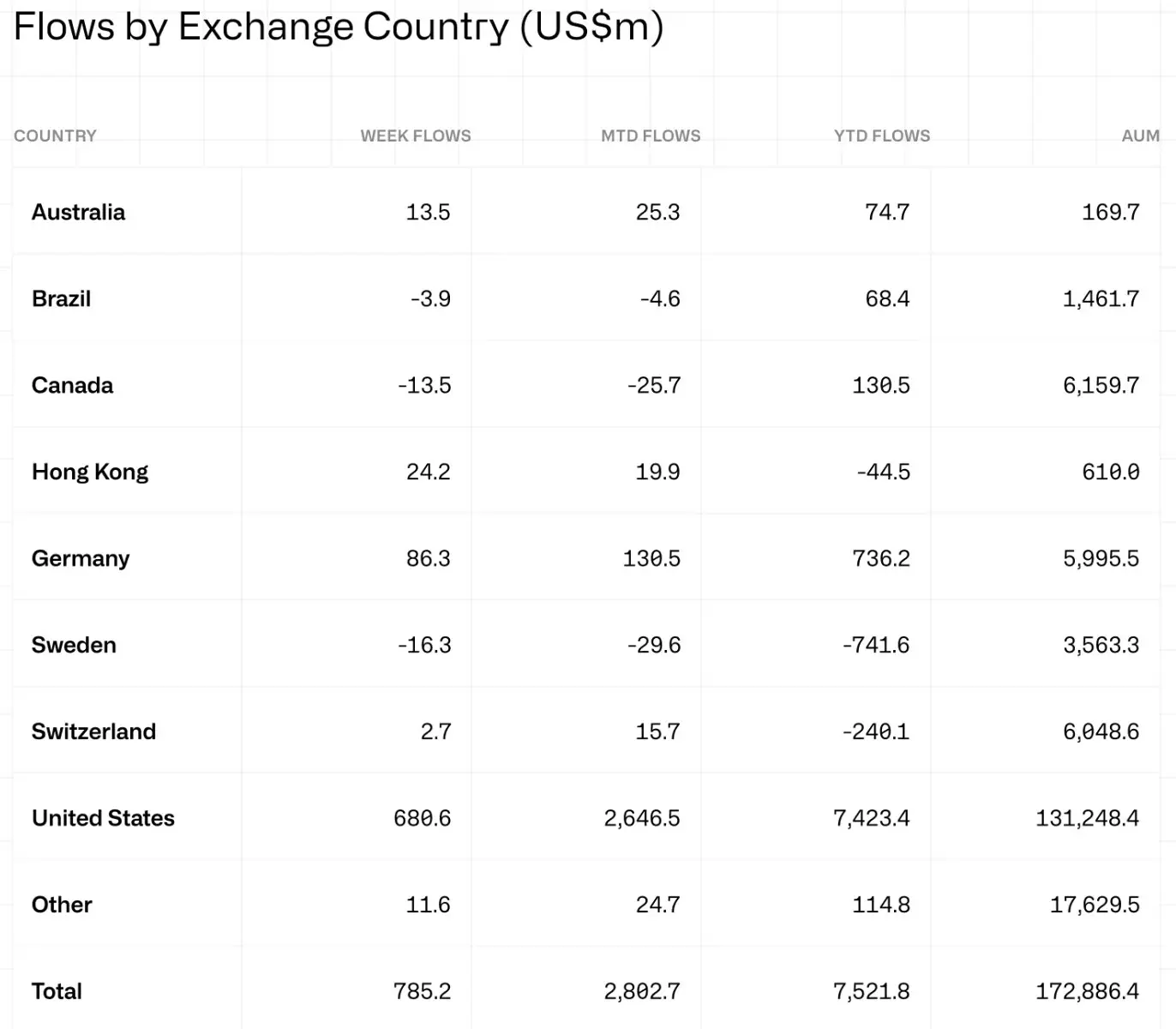 但一些关键市场的情况却出现了逆转。瑞典净流出1630万美元,加拿大损失1350万美元,巴西损失390万美元。瑞士小幅流入270万美元,澳大利亚则贡献了1350万美元。