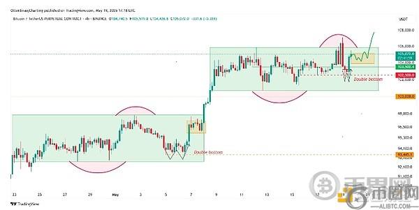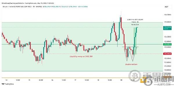 在 1 小时图上形成双底形态后,BTC 价格在美国市场交易时段回升至 105,000 美元以上。