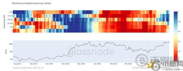 仅剩下1-10 BTC的持仓群体仍在分散。热力图从蓝色(分散)过渡到红色(吸筹),表明市场信心正在增强。从历史上看,这种趋势通常先于BTC价格上涨。