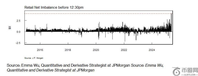 据摩根大通量化及衍生品策略师Emma Wu汇编的数据,截至纽约时间周一中午12:30,个人投资者净买入美国股票41亿美元,创下该时段有史以来**水平,并且**在中午前突破了40亿美元大关。