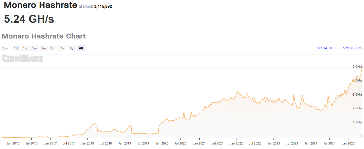 XMR 的复苏不仅体现在其市场活跃度上。门罗币的挖矿量达到了历史**水平,自 2024 年 4 月以来增长了一倍多。过去一个月,门罗币网络哈希率呈指数级增长,显示出作为新挖出的隐私币来源回归网络的趋势。