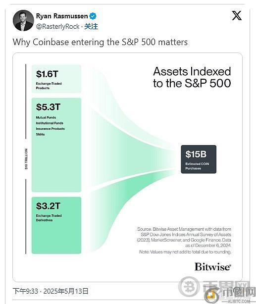 5 月 19 日,Coinbase 成为首只被纳入该指数的加密货币股票;据估计,此次纳入为该股票带来了 150 亿美元的资金流入,这意味着流入标准普尔 500 指数挂钩投资组合的每一美元中,约有 0.11% 被配置到这家加密货币交易所。