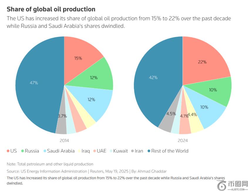 OPEC产量曾占全球石油总量的一半以上,但这一主导地位持续削弱。根据OPEC的数据,其市场份额从十年前的40%降至今年的不足25%,而美国的份额从14%升至20%。