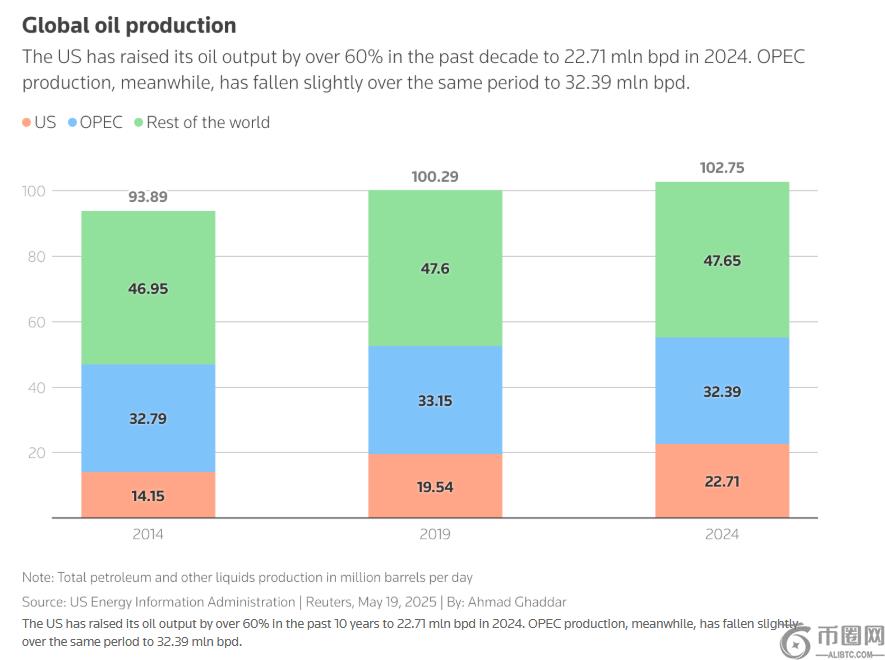 截至2024年,美国过去10年的石油产量增加了60%,OPEC同期的石油产量则有所下滑