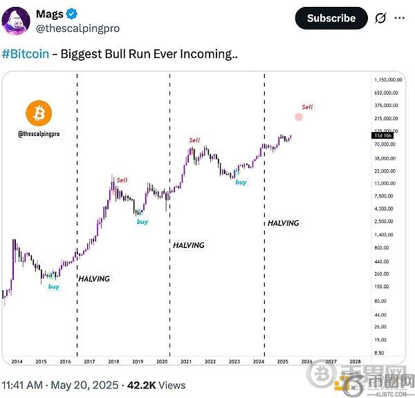 分析师Mags表示:比特币价格正在进入“有史以来**的牛市”,根据比特币四年减半周期,预计**价可能达到 215,000 美元左右。