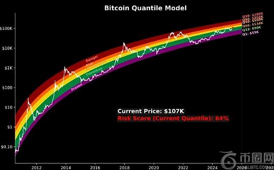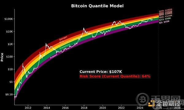 比特币分位数模型更新显示,比特币市场反映出与美国总统唐纳德·特朗普当选后以及2024年第四季度现货ETF推动的高点相同的“热度”。该模型使用分位数回归以对数刻度映射比特币的价格阶段,表明该加密货币正处于过渡区,这是加速阶段之前的关键时刻。在2024年第四季度,比特币在进入74,500美元以上的价格发现期后上涨了45%。 一旦进入加速阶段,就可能触发BTC的下一阶段或中期走势,通常在33%至66%的区间内。根据该模型,预计BTC将在未来几个月内逐步达到13万美元和16.3万美元的目标价位。