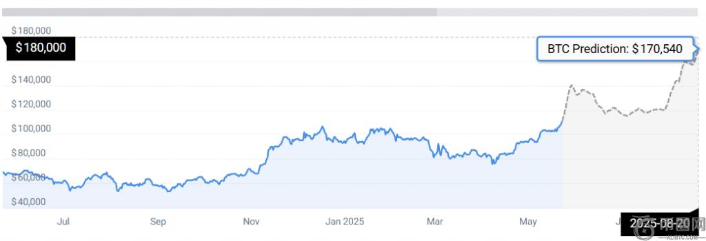 克鲁格对BTC 15万美元价格的预测与CoinCodex对比特币的预测相吻合。该门户网站也预测了该**的类似走势,并补充说,到2025年8月20日,比特币将达到17万美元。