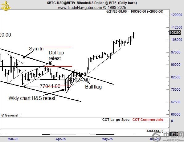 与此同时,资深交易员 Peter Brandt 对比特币在 5 月 21 日突破 109,000 美元后的表现进行了评估。在 X 上分享的图表分析中,Brandt已识别他的分析涵盖了多种持续形态,包括对称三角形、双顶的重新测试以及周线图上可见的头肩形态。值得注意的是,他的分析还包含一次牛旗形态的突破。
