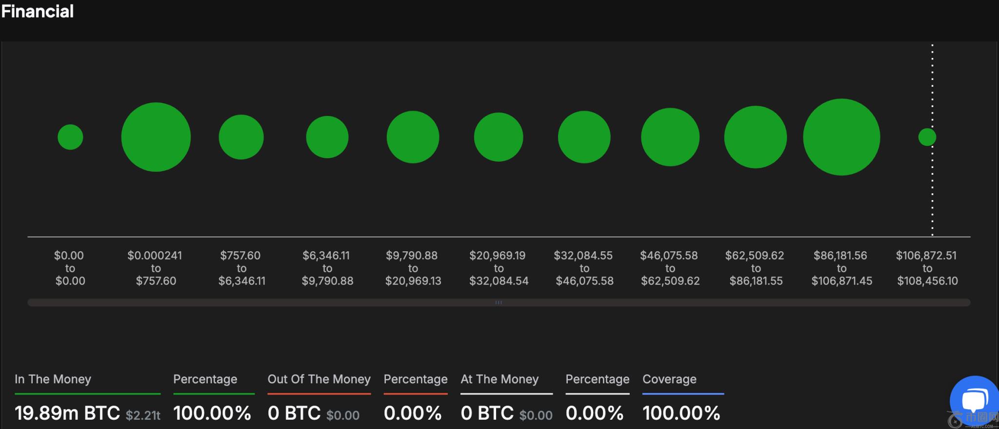 同时,没有钱包被归类为“价外”(Out Of The Money),这意味着目前追踪的BTC持仓中没有**一个处于亏损状态。这反映出,比特币的市场价格目前超过了数据集中所有钱包的历史购买价格。