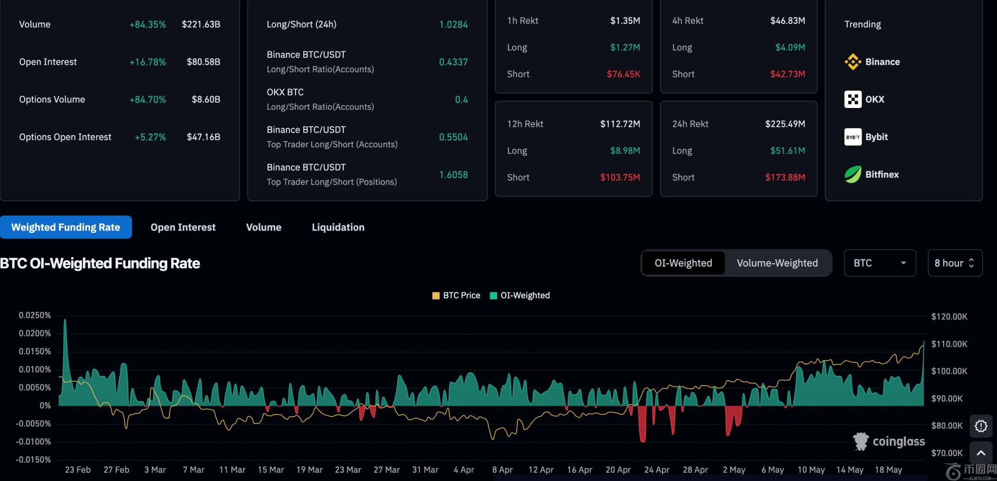 与此同时,比特币的衍生品市场也随着价格上涨而加剧。交易量增长超过84%,达到2210亿美元,未平仓合约增长17%,表明杠杆头寸激增。