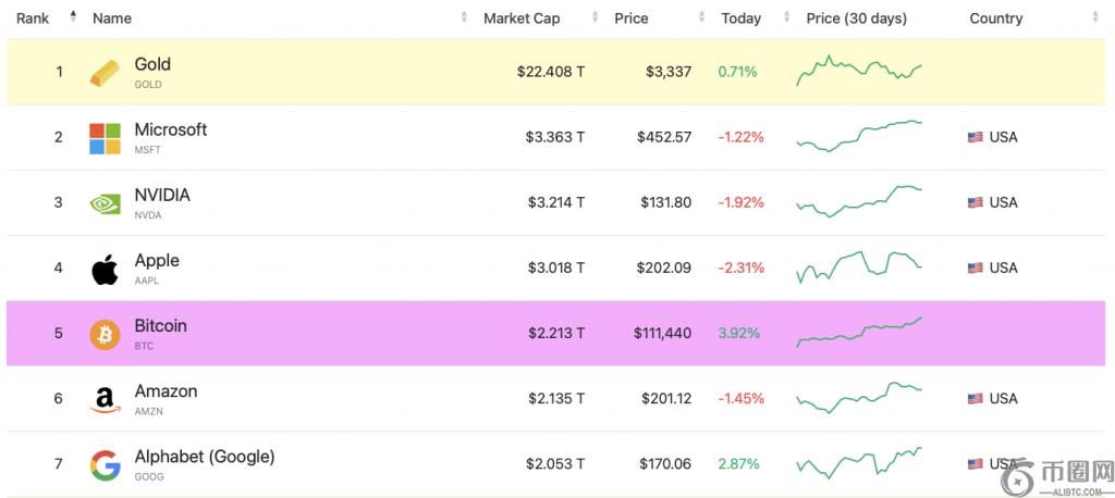 比特币(BTC)**突破11.1万美元大关,市值跻身全球五大资产之列。BTC近期上涨后,市值再次超越亚马逊。BTC目前的市值为2.213万亿美元。而亚马逊的估值则为2.135万亿美元。BTC目前仅次于苹果、英伟达、微软和黄金。