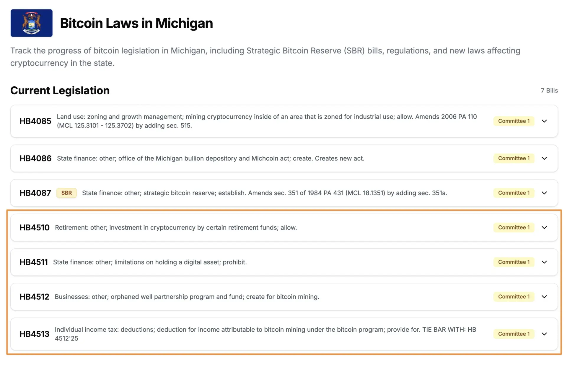 2025 年 5 月 21 日,密歇根州众议院提出四项新的加密相关法案,旨在澄清和促进比特币和其他数字资产在美国的使用。