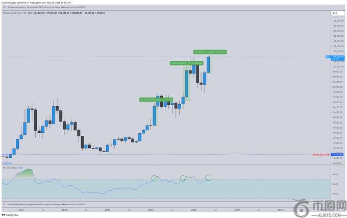 根据据这位匿名分析师称,当月度时间范围内的 RSI 读数达到超买水平时,比特币价格就会大幅上涨。