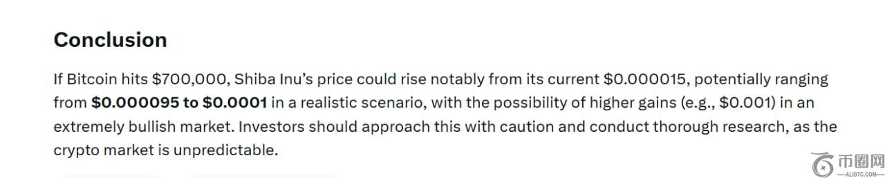 因此,如果比特币达到 70 万美元的目标价,聊天机器人会为 Shiba Inu 设定 0.000095 美元到 0.0001 美元的目标价。有趣的是,Grok 预测,在极度看涨的市场环境下,Shiba Inu 可能会瞄准 0.001 美元这样的雄心勃勃的目标价。