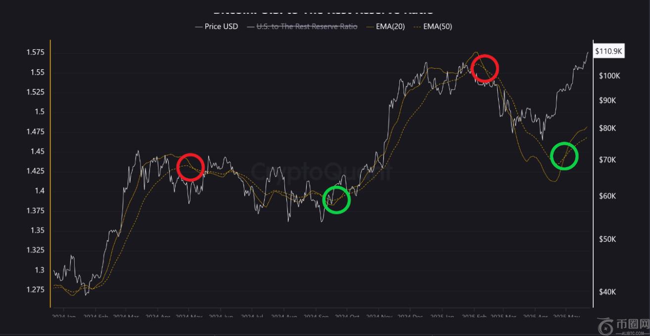 同时, dataCryptoQuant 的数据显示,包括交易所、银行和基金在内的美国实体在比特币持续上涨中发挥着越来越重要的作用。美国持有量的显著增长恰逢技术性“黄金交叉”的形成。