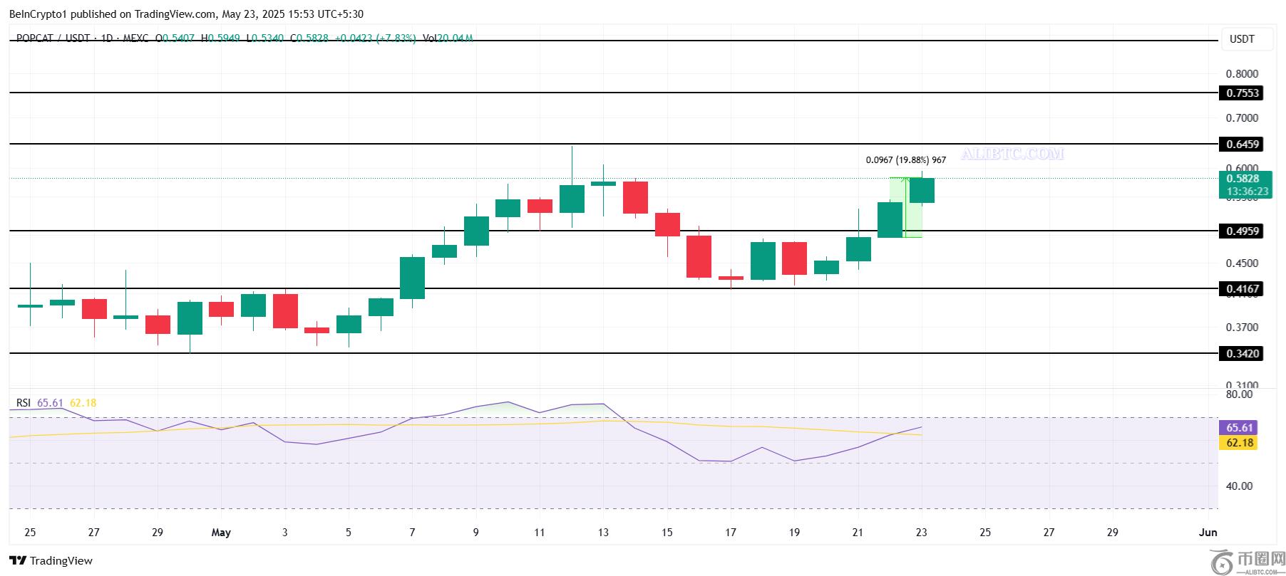 RSI指标显示,尽管 POPCAT 已进入超买区域,但仍有上涨空间。在之前的反弹中,即使在超买情况下,该meme 币也持续上涨。如果这一趋势持续,POPCAT 很可能会突破 0.645 美元的阻力位,并向 0.755 美元的目标价位迈进,延续其看涨势头。