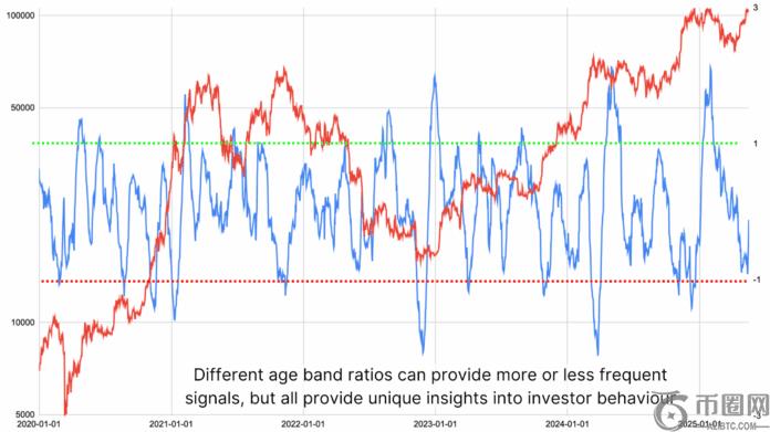 为了提高这些信号的准确性,可以通过比较近期入场者(持有 0-1 个月)和持有 BTC 1-5 年的人群,对数据进行更**的划分。这种年龄段的比较可以更**、更实时地洞察分布模式。