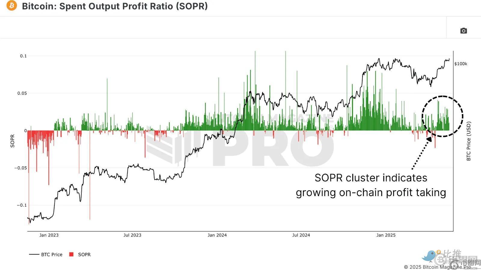 **已花出产出利润率(SOPR)**可即时洞察整个网络的已实现利润。聚焦最近几周,我们可以清楚地观察到利润实现的上升趋势。绿色柱状图的聚集表明,确实有相当数量的投资者在出售比特币以实现利润,尤其是在价格从74,000–75,000美元区间上涨至超过10万美元的新高之后。