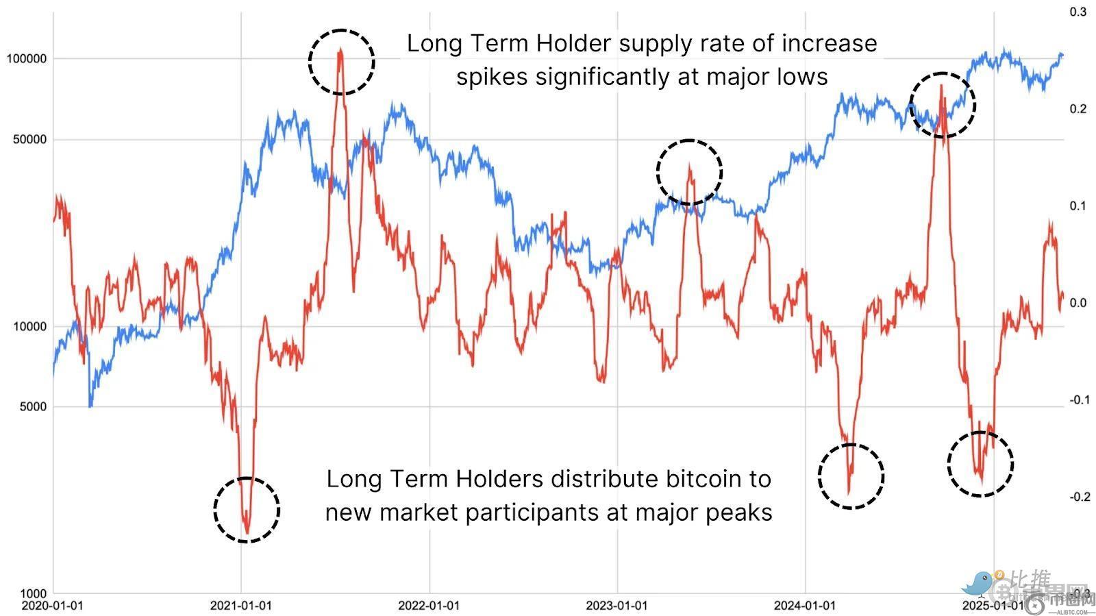 图4:长期持有者供应变化率与比特币价格呈反向关系。