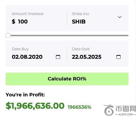 如果你在2020年8月2日投资了100美元购买柴犬股票(SHIB),那么今天的投资额将增长到190万美元。你的投资将增长1,966,536%(190万%)。